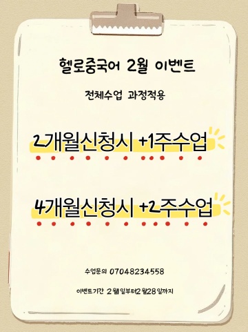 이벤트는 현금 적용입니다 . 新年快乐!事事顺心!새해복많이 받으세요!!수업문의 :07048234558이벤트 기간 :2월 1일부터 2월 28일까지