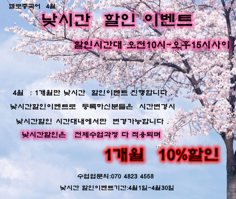 할인 시간대는 오전 10시~오후 15시 사이 수업 등록하시는 분들은